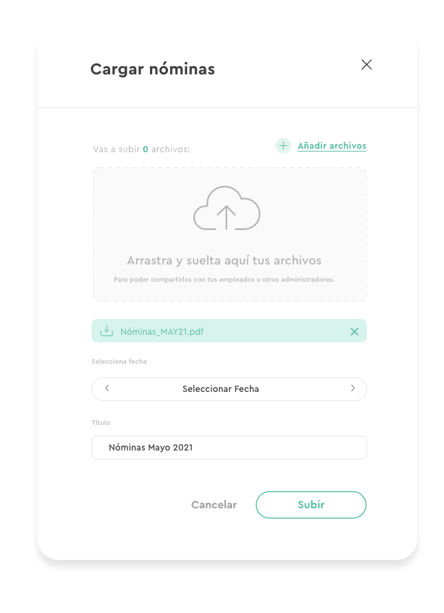 A partir de aquí accederás a una pantalla donde podrás adjuntar el pdf de nóminas que te haya proporcionado tu gestoría, simplemente arrastrándolo o bien utilizando el botón «Adjuntar documentos». Aquí mismo podrás completar la información de envío añadiendo el mes de envío y el título del envío con el que lo quieras nombrar.