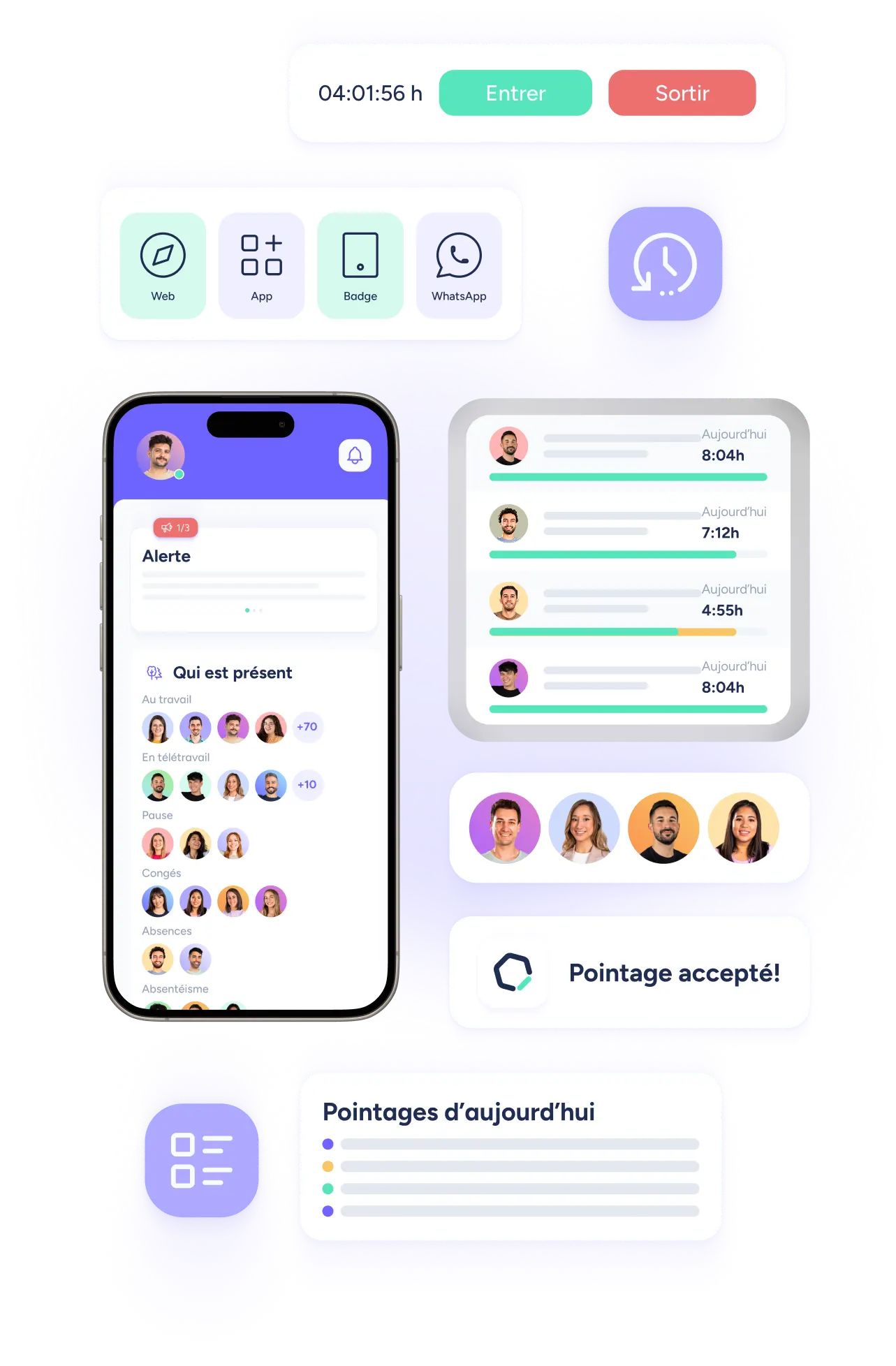 pointage par lecture d'un code QR dynamique affiché sur une tablette ou un appareil spécifique. Les employés scannent le code avec l'application mobile pour enregistrer leur journée de travail.